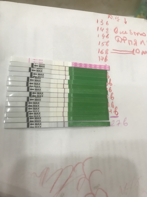Какой у вас в среднем цикл, сколько дней? Потому как судя по тестам овуляция была где-то в середине, потом опять на спад. Если у вас цикл примерно 28 дней, плюс минус, то последний тест скорее показатель того, что скоро м придут.