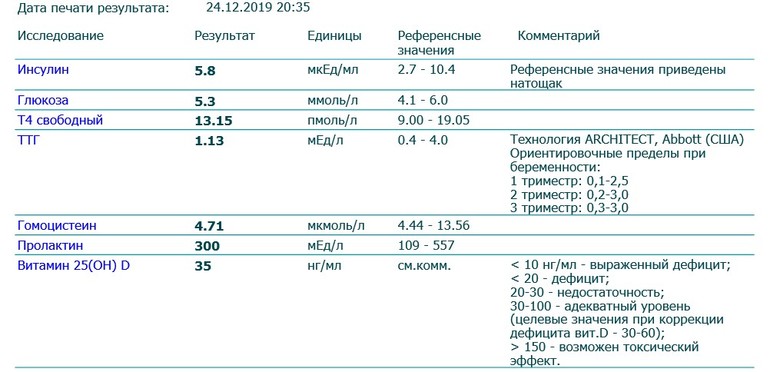 Инсулин и Глюкоза по центру нормы показателей, тут я рада. Витамин Д почти на нижней границе нормы, с декабря стала принимать витамин Д в каплях ежедневно, надеюсь, он повысился с тех пор.