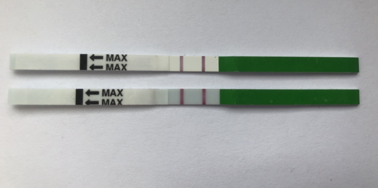 Овуляция( тесты на овуляцию)Верхний тест вчера в 22:30. Нижний - сегодня в 11:30. Думала, что полоска станет тусклой, а она снова яркая. Значит овуляция через 24 часа от последнего теста или когда?