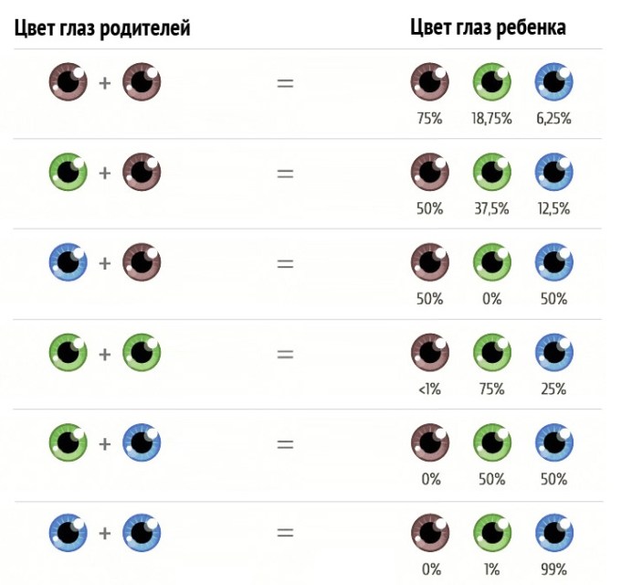 У меня каре- зеленые глаза и русые волосы, муж вообще темный как турок; ребенок блондин с серо- голубыми глазами 🤣( шутки про соседа надоели)