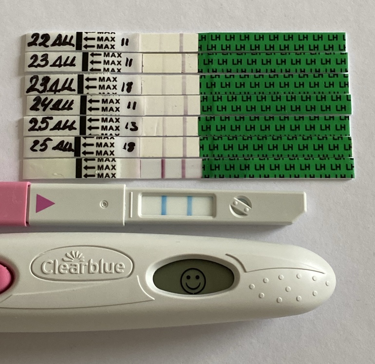 Нижний тест на фото это вчера на 26дц просто не отметила) это первый цикл после отмены ОК так что о его продолжительности я не знаю. Наверно будет около 40 дней. У меня обе Б так происходили, беременела сразу после отмены ОК при поздней О. Надеюсь получится и в третий раз)))