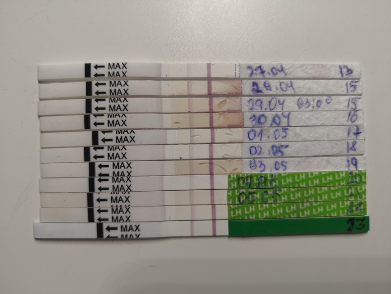 Овуляция( тесты на овуляцию)Девчонки, привет!Делаю первый цикл тесты на О. Так как месячные у меня нестабильные, то я понятия не имею, когда она должна быть. Приложу график циклов. Первые 10 тестов - фрау. Не делала только на 14ДЦ (могла пропустить О?). Последний тест - овуплан. Самая яркая вторая полосочка. Но может всегда у этой фирмы так? Или это может О приближается? Календарик говорит, что на 26ДЦ будет. Стоит ли мне ещё ловить ее?