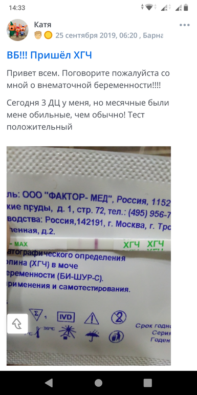 мой тест при вб. При хгч 91 нашли между трубой и яичником вб. Меня ни чего не беспокоило, кроме теста и странных мес.