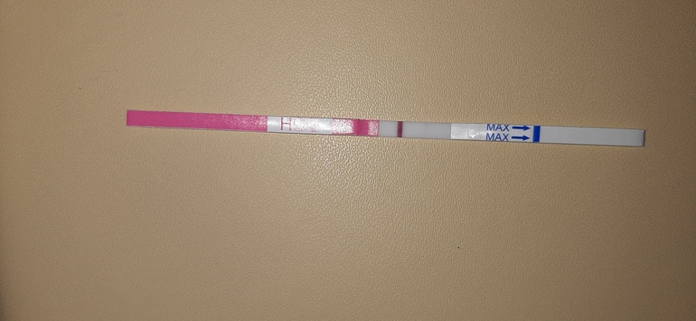 тест дешёвый самый, который был, 25 чувствительность. 5 минут как замочила. Полоска будто бы и розовая и будто нет... сегодня - завтра должны быть месячные