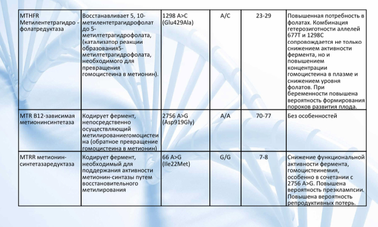 На самом деле круто у вас все описали, у меня не так подробно. По тому, что я знаю, у вас мутации в Фолатном цикле(почти у каждого), нужно держать на пульсе гомоцистеин, должен быть менее 6. много есть зелени, пить толькО активные фолиевую (метилфолат) и активный В12, обычная фолька у вас не усваивается и только вред несёт, остальное девочки поопытней напишут)