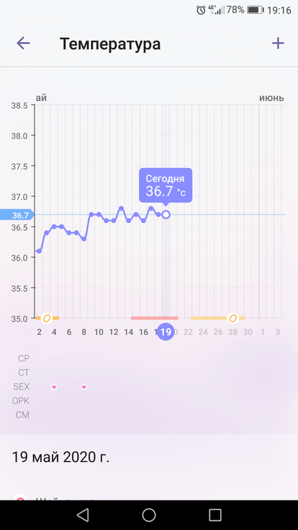 Фоликулометрию не делала, была 6 мая у Г, сказала, что левый яичник увеличен. Возможно только была О, либо киста под вопросом. Поэтому она мне УЗИ и назначила. Измеряю БТ орально, под язык. Вычитала, что БТ орально и ректально отличается на 0.3-0.4 градуса. И ещё принимаю Утрожестан по 100 мг утром и вечером с 16 ДЦ