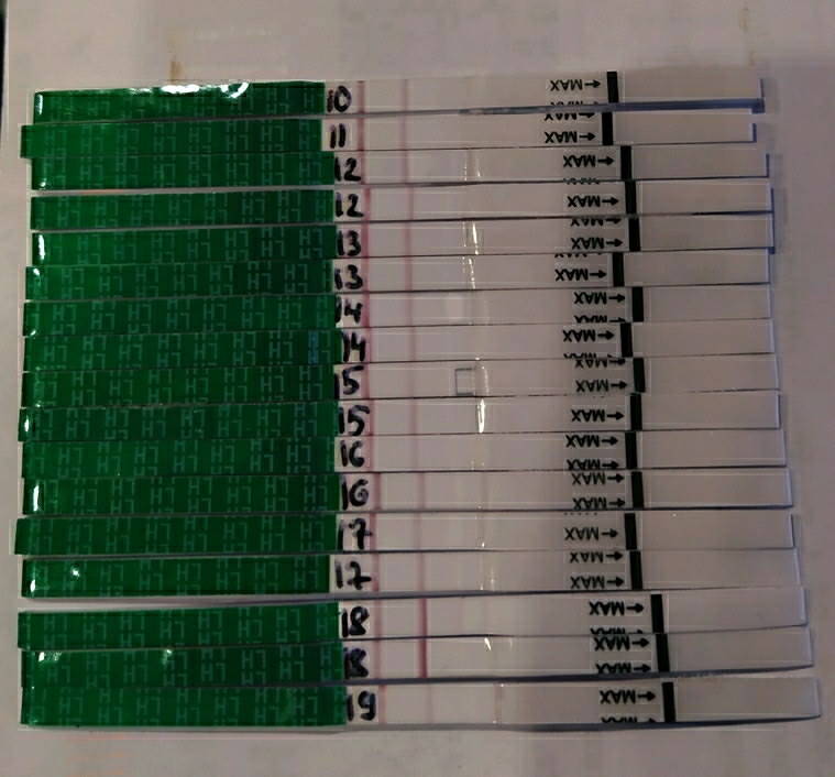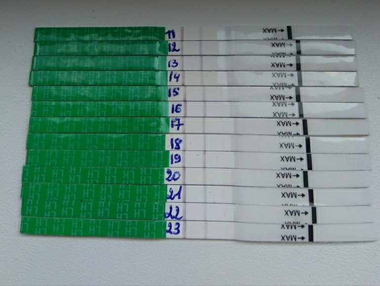 На тестах на овуляцию в любой день цикл есть // даже в ановуляторный они всегда полосатые,потому что лг в организме есть всегда, перед овуляцией они становятся одинаковые по яркости либо вторая ярче контрольной,вот первое фото цикл без овуляции ановуляторный и тесты в нем,второй с овуляцией,пик на 18 д.ц,овуля на 19