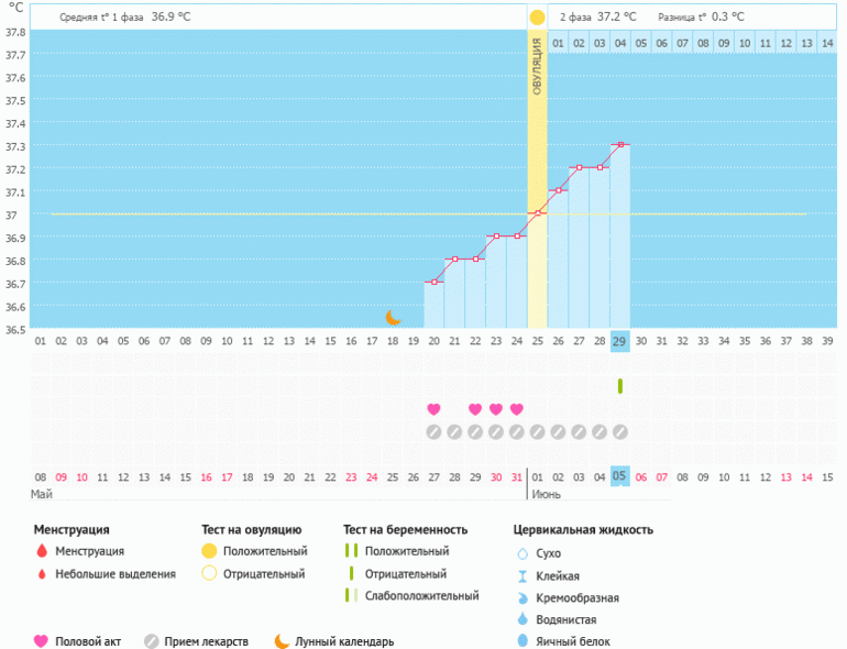 Я вообще даже не понимаю по вашему графику, когда произошла О, судя по программе, вообще при температуре 37, что почти невозможно. Должен быть скачок в течение 48 часов, который делит две фазы, а у вас ступеньки получились. Возможно, цикл вообще ановуляторный
