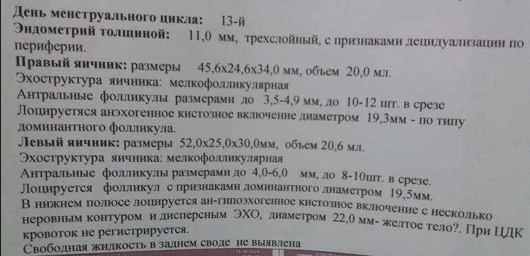 Это вряд ли, потому что прошлое узи было на 10 ДЦ и в ЛЯ на тот момент были фоллы 15 и 13 мм. По крайней мере про ЖТ на тот момент врач ничего не сказал и в заключении не отметил.