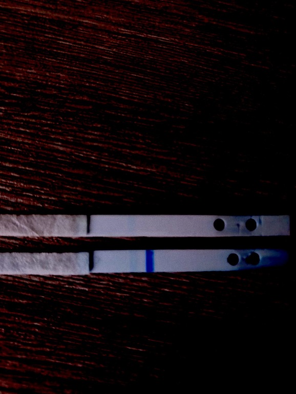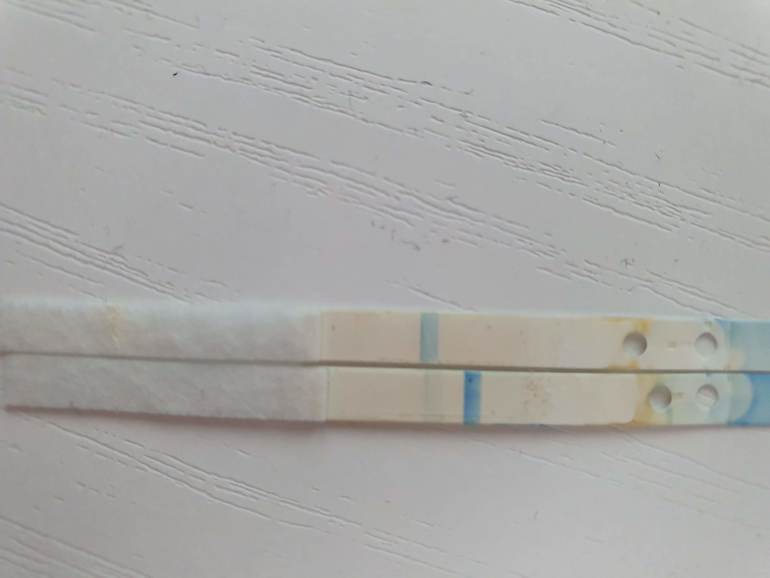 Там три полоски в случае с беременностью и две, если нет. Вот так выглядел у меня, когда только узнала. И вот чуть позже