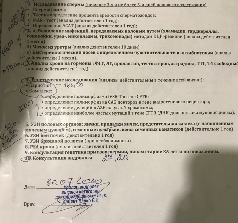 Были сегодня там. У нас на руках УЗИ яичек, УЗИ БП, гормоны (лечим повышенный пролактин у эндокринолога). Все анализы свежие, до недели.