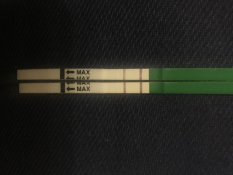 как я понимаю они должны быть по интенсивности цвета одинаковые с контрольной. По фото это вторая тест полоска