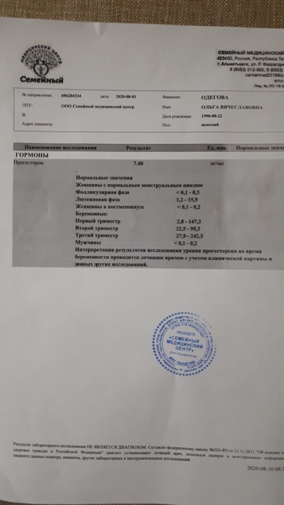 Другой вопрос, зачем Вас гиня на такой анализ погнала, если сама подозревает, что О не было? Анализ, по сути, неинформативен от слова совсем. Прогестерон надо смотреть через неделю после О, когда уверен в том, что О была точно.