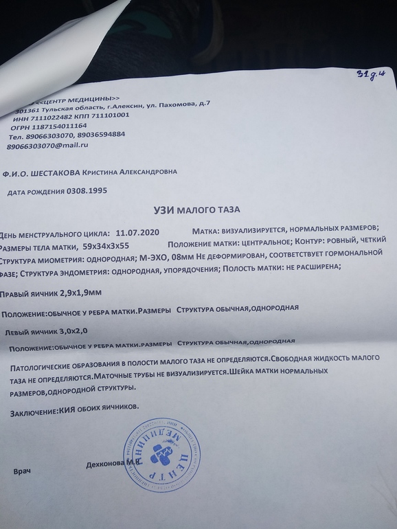 Врач в заключение поставила КИЯ обоих яичников. Не анализов не чего, говорит давай вызавим месячные (у меня 31 д.ц) и пей ок. Вот я и записалась к другому врачу