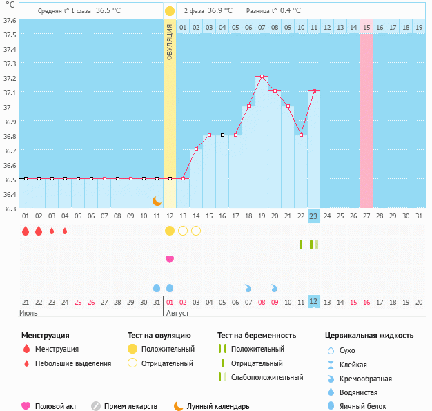 График БТ кому интересно, темп начала мерить на сл день после теста на О, с 13ДЦ. 1 фаза выставлена чтобы график мне О позволил нарисовать. Обычная t первой фазы у меня 36,5.