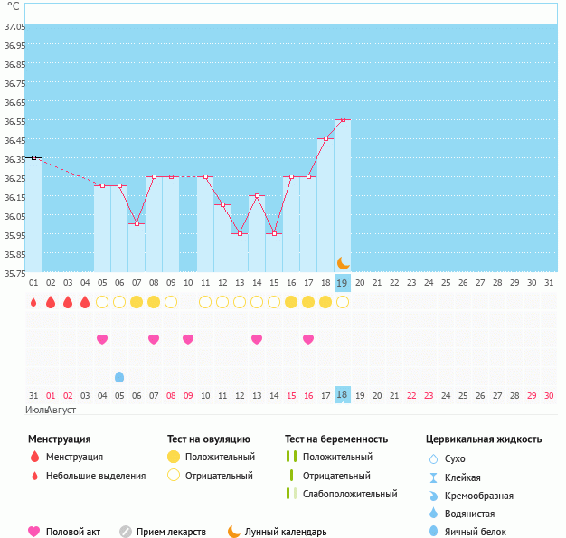 Базальная температура, ТТ, графики БТПервый цикл на фертине и впервые не могу понять, когда была О. БТ измеряю орально, она у меня обычно ниже ректальной на 0,2. Незадолго до О моя бт всегда делает скачок вверх (!). Всегда у меня О поздняя (28-35дц), а тут пораньше, но симптомы слабее. ЯБ был скудный, отмечен на графике. Характерная боль в боку была в пятницу вечером (обычно она у меня сильная, сразу с утра на следующий день после О), но в этот раз была слабее. Выделения крем уже в субботу вечером точно были. Тесты в этот раз не делала. Смущает низкая бт второй фазы, обычно разница хорошая и бт не скачет, а тут ерунда какая-то. Жду ваши комментарии, что думаете, когда была О и что вообще думаете по графику