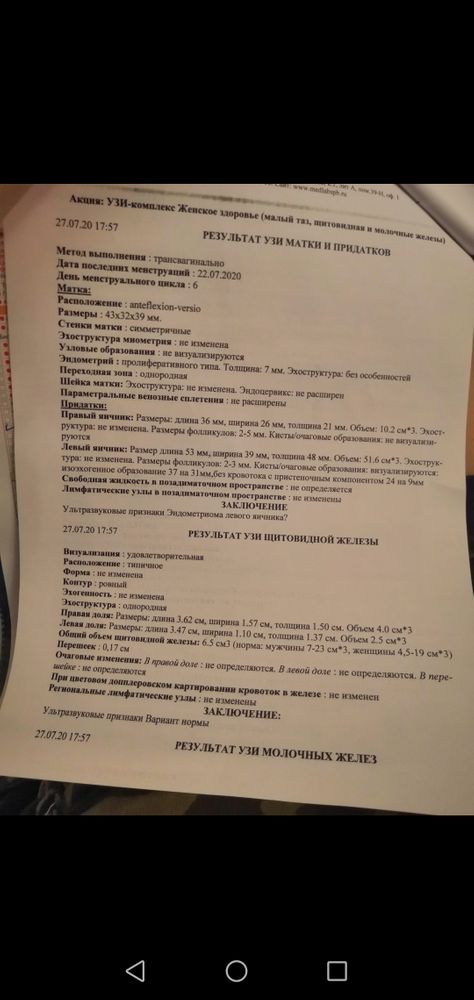 АнализыДевочки, привет 👋 Давно меня тут не было... Может кто и помнит меня 😄 Немного предыстории. Начали планировать в марте 2019 года, в феврале 2020 уже нервы на пределе, пошли проблемы с работой, перестали планировать ребёнка( И обследоваться соответственно тоже не пошла. И тут начались постоянные сбои. За эти полгода 3 раза останавливала кровотечение транексамом. Боли во время месячных просто ужасные 😰 не разогнуться. После отпуска, наконец то решилась пойти на узи. Попала на акцию, комплекс узи (омт, мол.железы и щитовидки). И все оказалось далеко не радужно у меня... Киста и эндометриома левого яичника под вопросом. Я так поняла из диалога, что кисту надо оперировать 😢 И причина неудач скорее всего во мне, из-за эндометриомы. Проверить партнёра не могу уже, так как мы с ним почти в разводе, живём отдельно (разводимся не по этой причине)