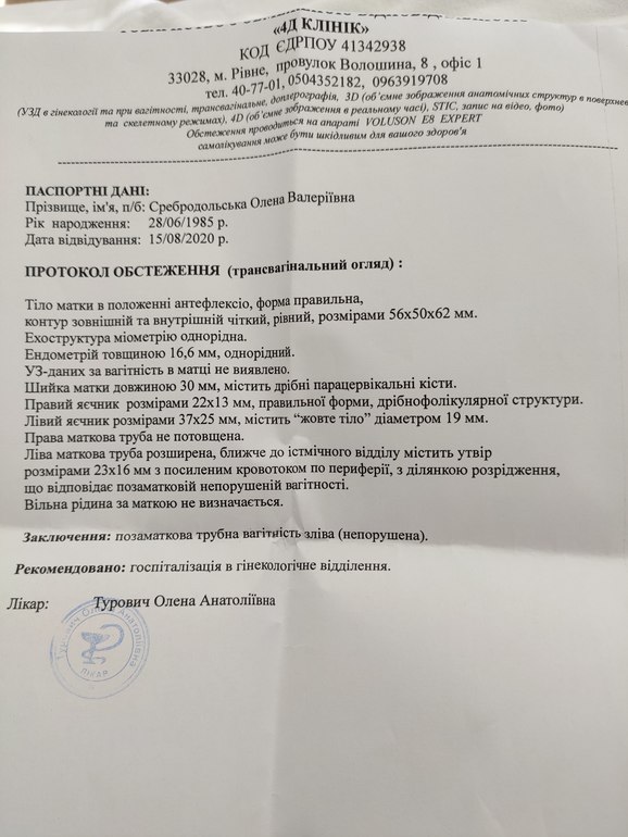 Предложили вызвать скорую. Я отказалась, со мной была подруга, мы поехали в областную больницу. Меня там положили в гинекологию. Предложили сразу делать полосную операцию, или попробовать дождаться лапароскопии. Это была суббота, а лапароскопии делают только по буднях. До понедельника я лежала и старалась не шевелиться, только в туалет вставала. Меня ничего не беспокоило, немного тянуло в боку, если б не УЗД не обратила бы внимания и до бегалась бы до разрыва. Долежала. В понедельник в обед перевели в лапароскопическое отделение. Перед операцией сделали УЗД. В трубе была уже кровь, начинался разрыв. Сразу прооперировали, около часа была операция. Через несколько часов, поставили на ноги. Трубу вырезали, вторая в отличном состоянии. Сегодня меня выписывают. Состояние хорошее. Вывод из всего этого что ранее УЗД не вред а польза. Спасибо что дочитал до конца, нужно было выговориться. Всем желаю удачных безпроблемнных беременностей.