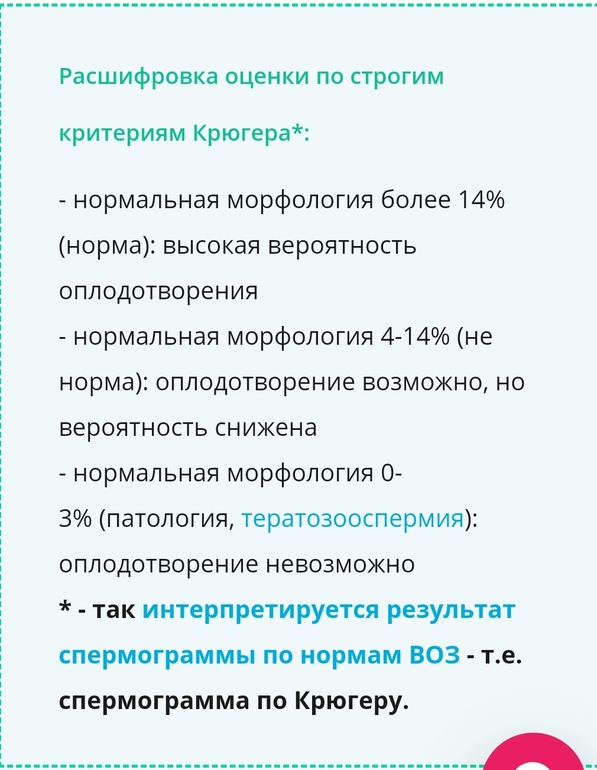 С чего вы взяли? Нет результата на руках, а так все тоже самое написано (норма от 4%,и сноса на рекомендации ВОЗ 2010 как в СГ автора) . Если бы делали не по Крюгкру, то и нормы бы другие стояли! Да и опытные врачи смотрели, андролог со стажем и статусом - нареканий нет!!