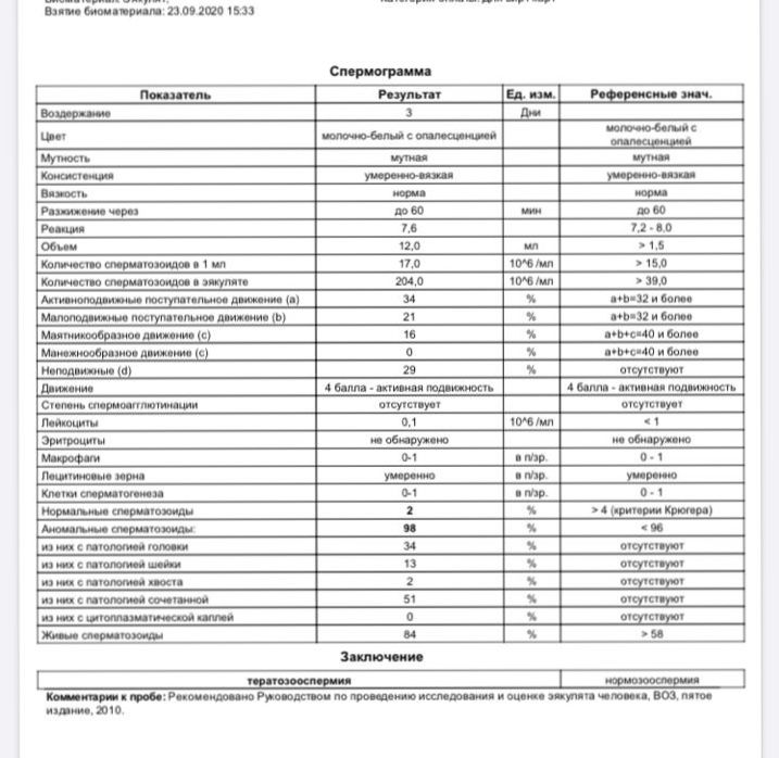 🤦♀️🤦♀️🤦♀️морфология 25% по Крюгеру не бывает.Максимум 15% , но может у вас уникальный случай, и из-за пива морфология не ухудшается, алкоголь влияет на подвижность, чтоб сдвинуть морфологию с места это такие мощные препараты надо пить и то не факт.А с 25% на 4% потом на 34% таких качель по Крюгеру не бывает в апреори. Вот когда у вас был показатель 4% это по Крюгеру- это хороший нормативный показатель.👌👍 За добросовестность клиник могу сказать одно, ЭКО клиники зачастую в своих целях занижают морфологию и ставят МФ в нашем случае произошло так же.Мы сдавали СГ в трех алиниках в разных городах, в одной Московской именитой 2 раза с промежутком в полгода они пишут морыология 2% и всё тебе. Ездили в другой город 7%, сдавали в Москве в клинике 8% приехали к этим неродивым сдаем 2% при том что ни алкоголя ни антибиотов ничего, муж год пьет бады и витамины.Везде ставят нормоспермию, а именно в этой одной клинике тератозооспермия и всё эко+икси.Вот такая история.