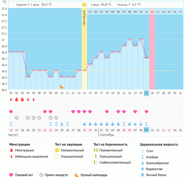вот так он выглядит. вам программа сама выставит когда была овуляция и красным нарисует день, когда должны начаться месячные