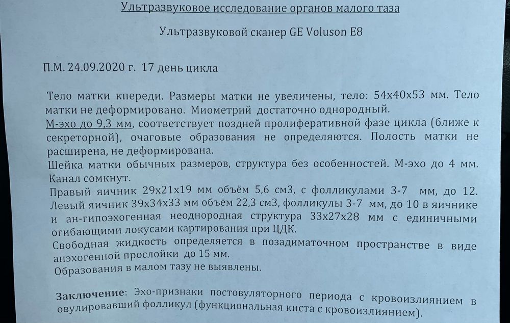 Сегодня 17 дц, на днях должна была быть овуляция... была сегодня на узи, вот что сказал врач: «Что либо была овуляция и вышла яйцеклетка на оплодотворение, и после произошло кровоизлияние. Либо просто жидкость вышла и произошло кровоизлияние. Но как врач сказал, что ему кажется, была овуляция, потому что много жидкости вышло.. и все свидетельствует об этом. Теперь идти в субботу следующую, и смотреть, есть ли там ЖТ или нет.»