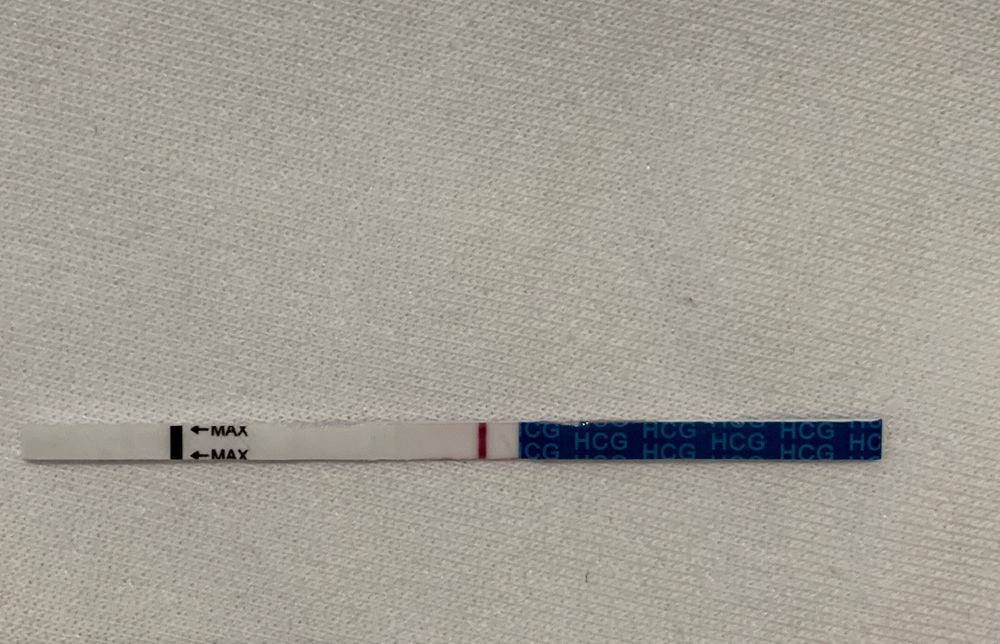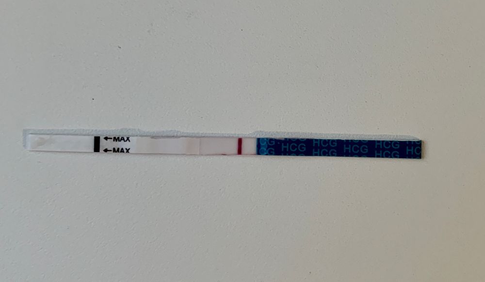 Мне кажется тест с браком, там внизу полоски зазубрена или углубление, вот там реагент и подзастрял и кажется лёгкая полосочка, но она не в том месте.