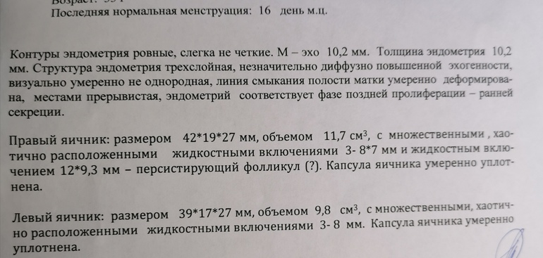 Нет, не было. Сейчас ставят Мфя. Пью эутирокс и метформин. История такая, по назначению пила кок около 5 лет, для мц и не планировала ещё тогда. Как решили планировать, в результате обследования выяснилось, что 0 своей нет. В прошлом мц могло не быть и по полгода. Назначили дюф для вызова мц, чтобы проверить гормоны. Потом, не дообследовав, как я сейчас понимаю, стали стимулировать клостом одним, безрезультатно. Поставила спкя. Отправила на лапару. Решила проконсультироваться у другого врача. Назначила до обследование. Выяснили что повышенная инсулинорезистентность и высокий ТТГ, назначили эутирокс и метформин, в следующем цикле пришла первая моя О на 11 дц. А в последующем цикле снова не было О, ну и сейчас вот такая картина.