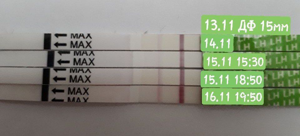 Овуляция( тесты на овуляцию)Привет, девочки! Подскажите, пожалуйста, вот такие у меня тесты, 13го доминантный фолликул был 15мм, то есть сегодня он в районе 21мм (хотя в доминантный он вырос из 6мм до 15 за 3 дня, может и сейчас больше вырос?), полосочки вроде ярчают, но их же еще нельзяя считать положительными? Боюсь, что снова в кисту перерастет, как в предыдущих циклах, а с прошлого цикла в другом яичнике так и не прошла с мц, но не может же быть всё настолько плохо и снова киста?