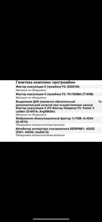Я сдавала в гемотесте анализ «генетика комплекс протромбин» (из пяти самых основных): f2 g20210a, f2 thr165met, F5 leiden, fgb g-455a, 4g/5g pai-1, гематолог их назначила, сказала, этого достаточно.