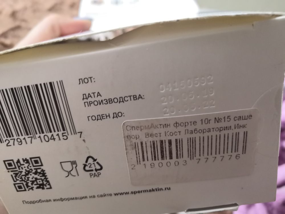 Получается, цена 22 пакетиков 4800 рублей была на тот момент, а сейчас намного выше. Спермактин 15 пакетиков находится в упаковке, но она вскрыта. 7 пакетиков отдельно россыпью. На коробке снизу указан лот и срок годности. На каждом саше есть информация о лоте, информация лота на всех 22 пакетиках соответствует лоту с коробочки, это говорит о том, что каждое саше годно до 20.05.2022г.