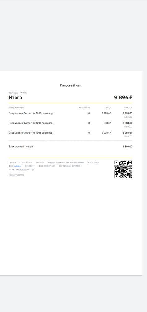 Есть электронная копия чека о покупке (покупали в апреле 2020г, за 3298 руб за пачку из 15 саше, сейчас такой цены даже не найти).
