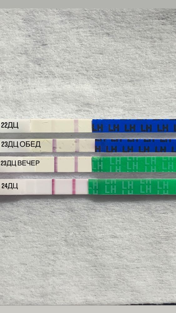 Овуляция( тесты на овуляцию)Добрый вечер! Сегодня 24ДЦ.На фото тесты на овуляцию, верхние 2 Клевер, нижние 2 Эвиплан. Я не понимаю, на 23 дцв ярче? Овулю ждать сегодня или делать тесты дальше? Не припомню таких полосок у себя, аж растерялась. Это сегодня получается овуляция?