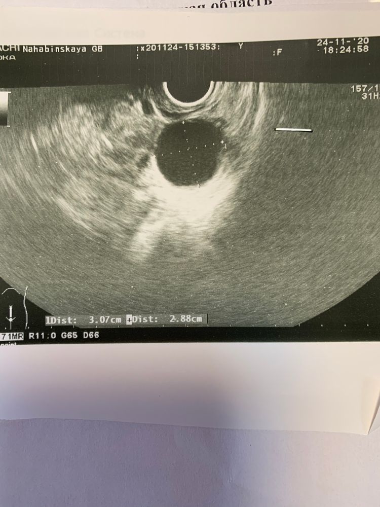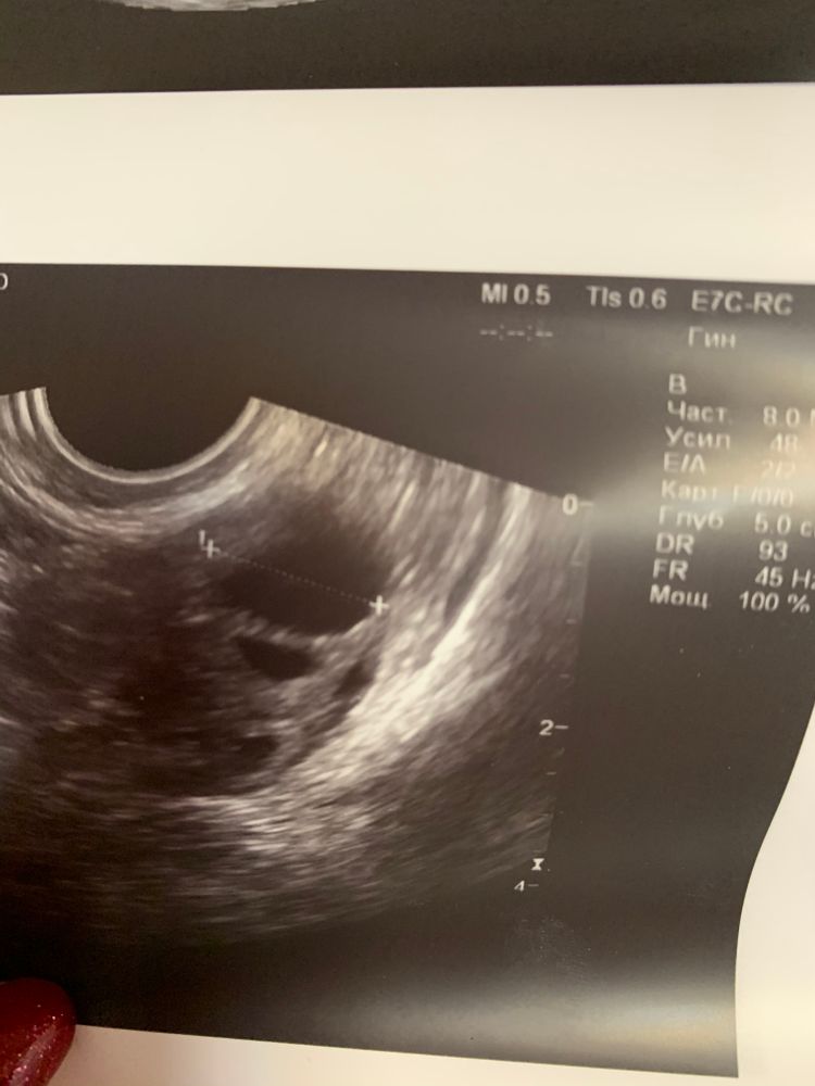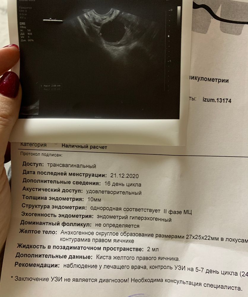 Дальше иду в другую клинику на 16 дц, там уверенно мне говорят есть киста жт с кровотоком ( даже показала) и жидкость овуляция была день -два назад . Вот фото