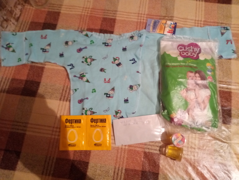 Здесь распашонка, подгузники, 2 пакетика фертины, 2 баночки со слаймами и тест на беременность, цитирую: "тест с двумя полосками:)" Надеюсь, моя фея окажется права и в воскресенье я увижу на нём чудесный привет от малыша💗