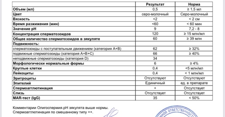 pH эякулята выше нормы, объем эякулята ниже нормы, наблюдается спермоагглютинация по смешанному типу ++.