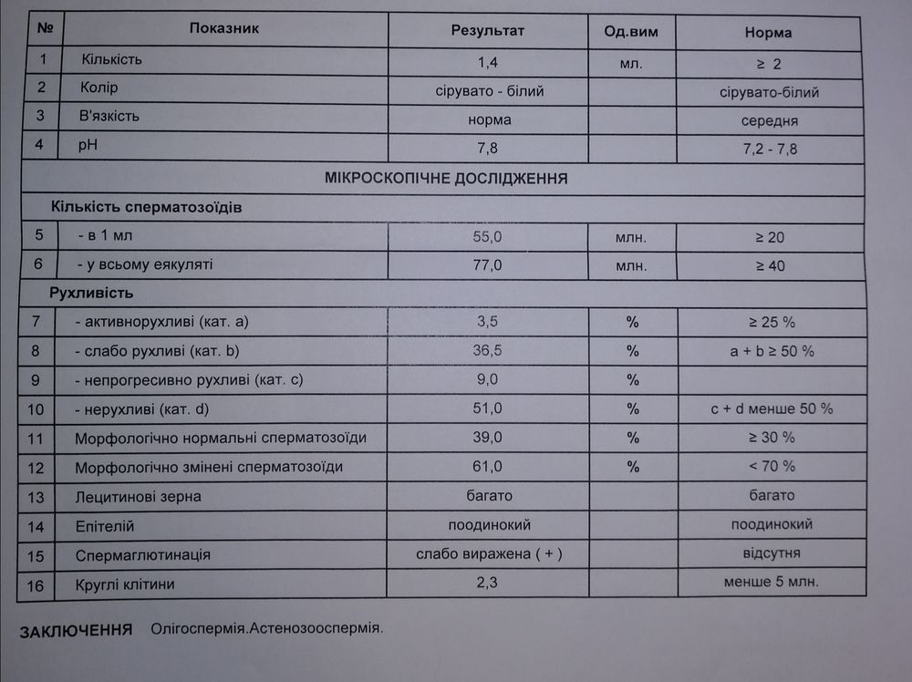 Спермограмма сделана с какими то странными нормами,надо пересдать по ВОЗ от 2010г.