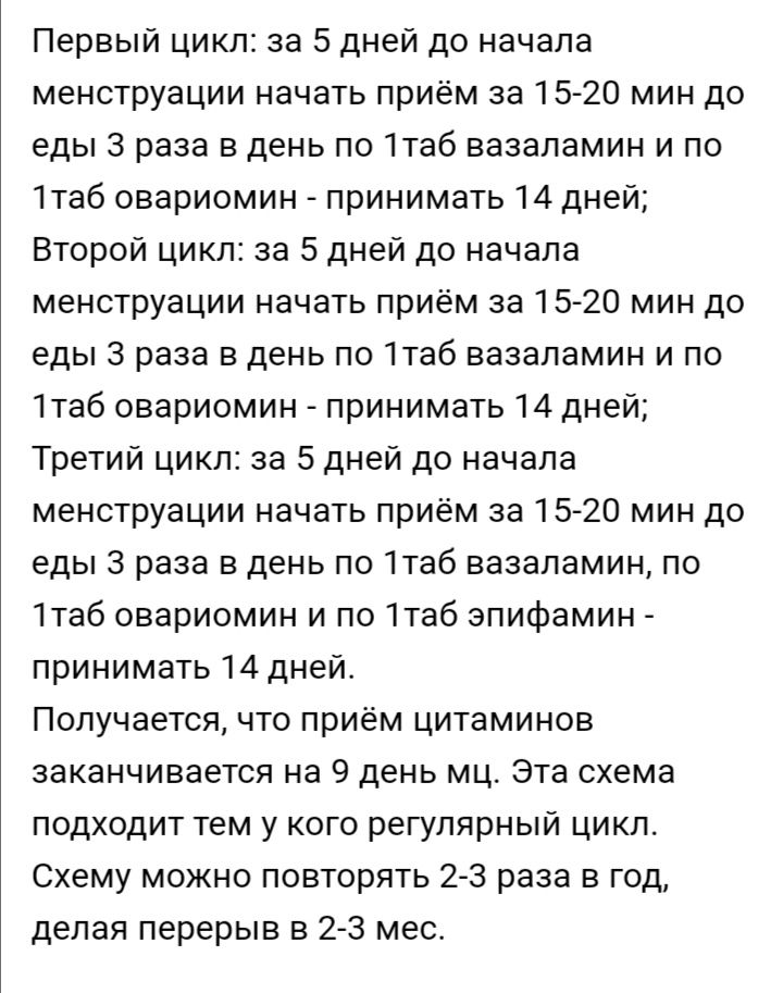 Сейчас пью первый цикл Овариамин. Только начала принимать с 1 дня цикла и до 14. Вроде всем так назначают. А зачем за 5 дней до месячных? Результат потом будет понятен, когда на фолликулометрию схожу. У меня проблемы с овуляцией