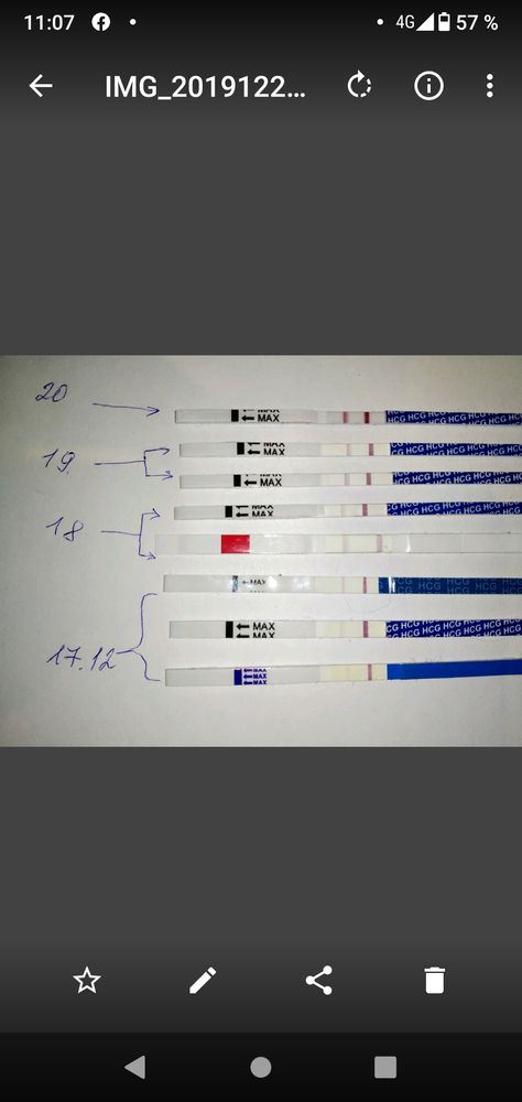 Это тесты сейчас : первых два сделаны на 7-8дпо, а два последних сегодня,что бы исключить реагент,так как тест полежал,я переделала его и полоска появилась сразу..