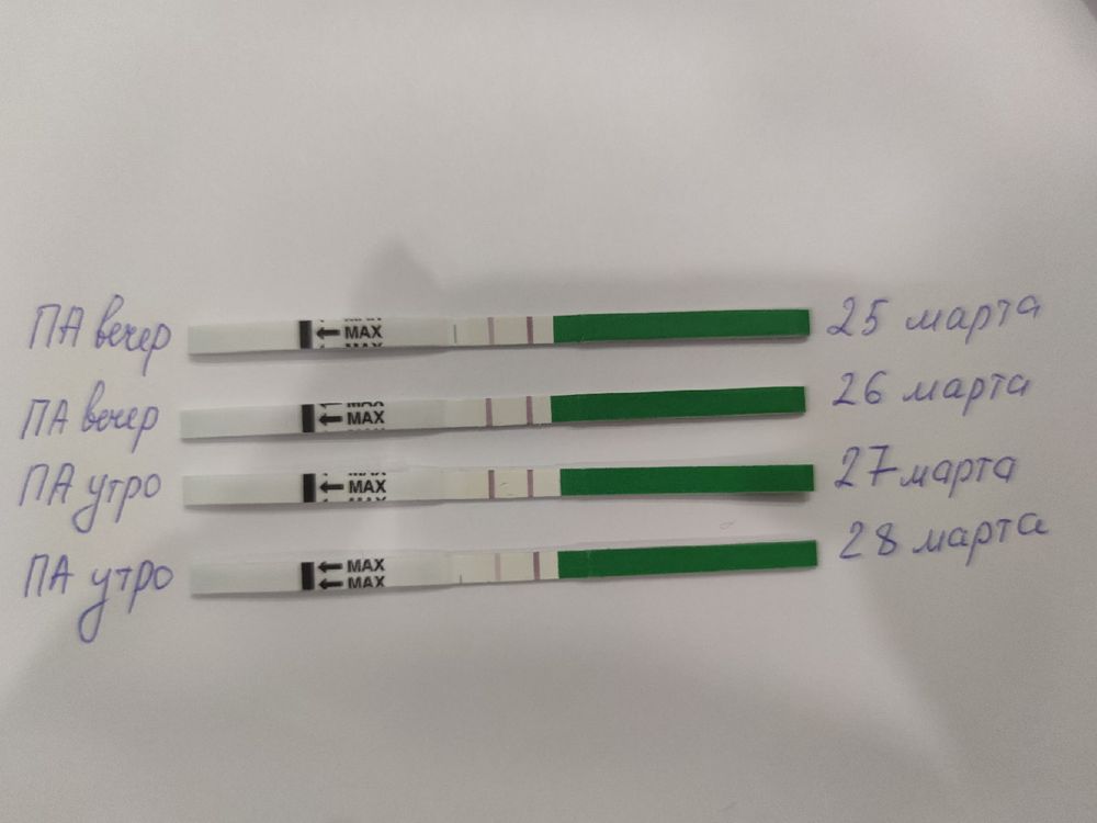 Karina Gan, О происходит после пика от ЛГ в течении 12-48 часов. У меня один раз в 16-00 был пик ЛГ по тесту, как у вас 27 марта, а ночью примерно около двух произошла овуля. ПА бул утром и наступила Б.