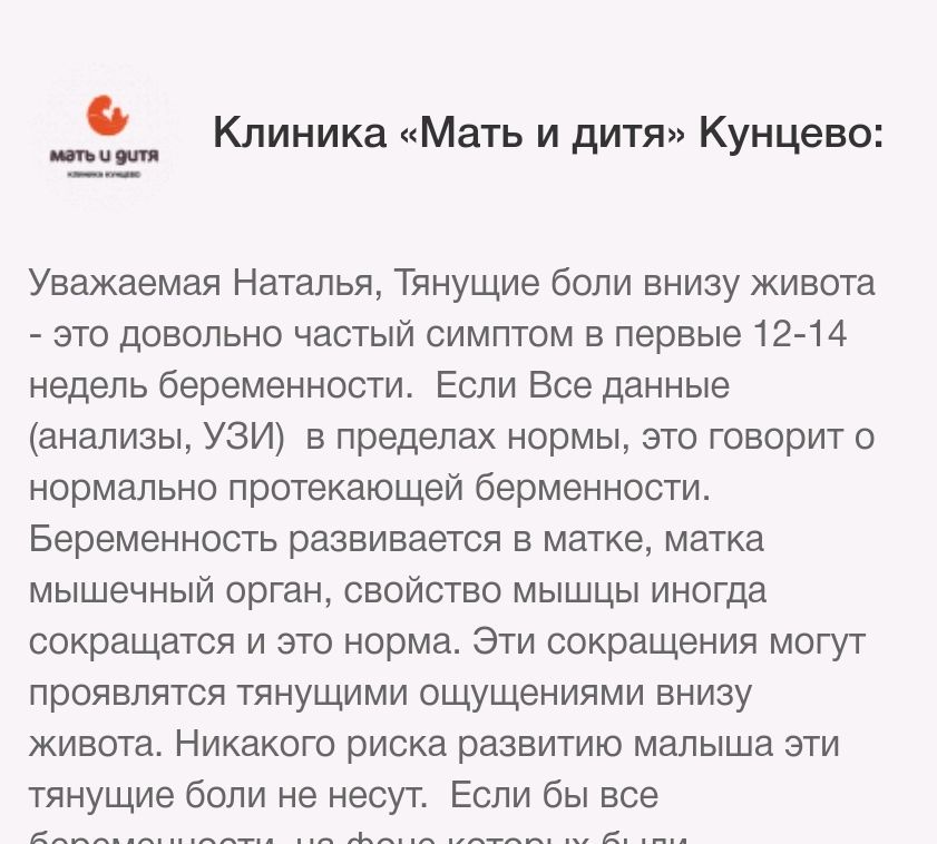 Викулинка, Здравствуйте про тянущие я соглассна боли, но про схваткообразные там не написано что это норма, и она не может быть нормой до третьего триместра. Затем я писала что у меня были тянущие боли как перед месячными и это не считается нормой, я вам могу много статей найти, есть просто тянущая боль которая у меня сейчас бывает а есть как перед месячными, тут вся важность про интенсивность и ТД. Потом я уже все публикации и книги Белоконь и Березовском прочитала, и не со всем я соглассна, например про гипер тонус, когда он у меня был я насмотрелись их и не стала принимать нечего и в итоге кровотечения литр крови потеряла еле сохранили, затем Березовская утверждает что писсарий не эффективен и это маркетинговый ход кроме ушивания нечего. И вы знаете мне слава богу шикарно помогает писсарий и не нужно было подвергать малыша наркозу. Затем на счёт новой публикации Белоконь, по поводу ГТТ с нагрузкой глюкозы 75 мг и прочее, вон сколько у женщин после этого в подают в кому гликимическую, и по мимо этого у многих начинаются преждевременные роды, или токсикоз после этого такой что в больнице потом лежат потому что нечего не могут съесть и выпить , а она пишет что он обсолютно безопасен и должна каждая беременная сдать. Да диабет опасен, но можно контроливпть иначе он все равно покажет со временем а осложнения за неделю не появляются. Потом насчёт прогустиновой поддержки если у женщины плохо выробатывается прогестерон то это может привезти к потере беременности, гипертонусе который наранних сроках опасен между прочем, при том что они утверждают что это норма ( норма это когда матка сократилась и расслабилась сразу, а не сутками напряжена, для этого и вырабатывается организмом гормон хгч, и прогестерон и если этих гормонов выробатывается не достаточно матка не может расслабиться, тем самым происходит естественный отбор как утверждают врачи) потом по поводу ицн они пишут что он ставится и проверяется активно шейка матки только после патерь 2-3 беременности и вы считаете это нормой? Я благодаря своим ощущениям сохранила и не стала уже их слушать , а стала слушать свой организм. У всех все индивидуально и организм у всех разный, и ведёт себя по разному, и врачи ещё до конца не знаю что и как 100% обернется. Поэтому дело ваше я вам написала из личного опыта. Желаю вам лёгкой беременности ❤️
