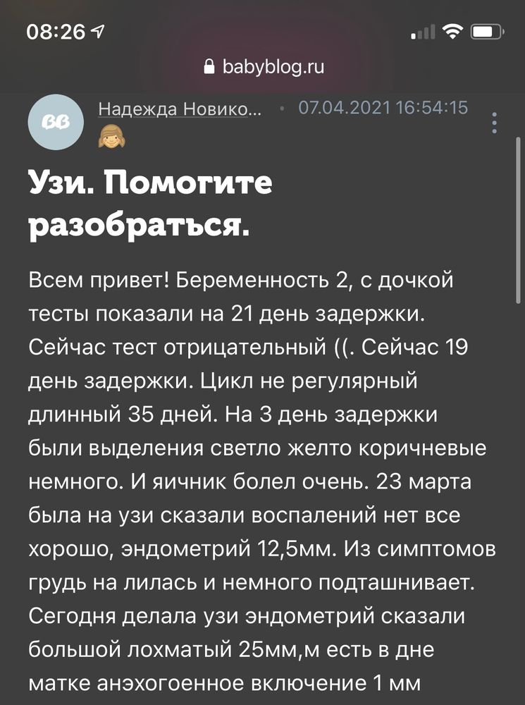 ФолликулометрияВсем привет! Беременность 2, с дочкой тесты показали на 21 день задержки. Сейчас тест отрицательный ((. Сейчас 19 день задержки. Цикл не регулярный длинный 35 дней. На 3 день задержки были выделения светло желто коричневые немного. И яичник болел очень. 23 марта была на узи сказали воспалений нет все хорошо, эндометрий 12,5мм. Из симптомов грудь на лилась и немного подташнивает. Сегодня делала узи эндометрий сказали большой лохматый 25мм,м есть в дне матке анэхогоенное включение 1 мм (кружочек такой черненький). Подскажите что это значит? Плохо это?