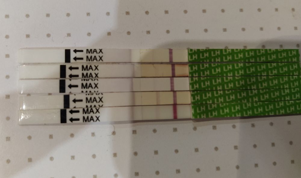 Овуляция( тесты на овуляцию)Цикл 23-28 дней. Начала ловить овуляцию с 8 дц, т.к. появился ЯБ (немного). До сегодня думала, что не будет ее или рано очень, т.к. тесты бледные очень. Сегодня (11дц) сделала перед обедом - неплохая такая полосочка (второй снизу). Уже начала строить планы на завтра на мужа🤣 А сейчас сделала еще один (19:20), а он бледный опять (нижний)!