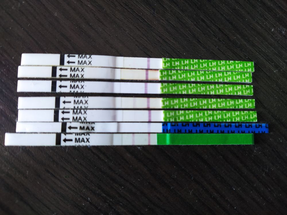 Делаю тесты на овуляцию с 8 дц, т.к. цикл 23-28 дней. Вчера в 11 утра тест стал ярче, но не положительный. Вечером бледный очень. Все тесты Фрау из одной пачки.