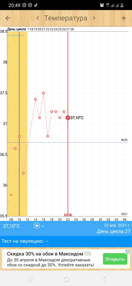 График вот такой… у некоторых БТ падает за несколько дней до М, у меня пока держится, надеюсь не упадёт и наступит моя долгожданная беременность! бусяяя я жду тебя 🥰😇🤗