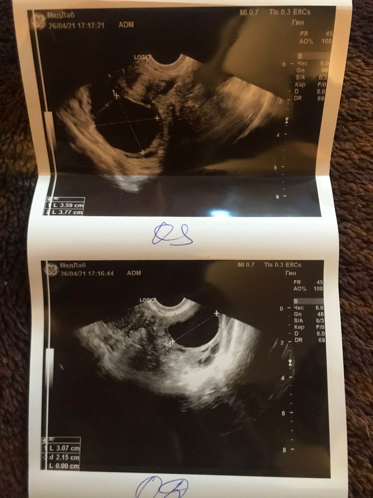 Так вот, немного отвлеклась, я хотела как можно скорее записаться на узи, ещё в субботу, позвонила, назначили на вечер понедельника(сегодня), ехала в такси и меня всю трясло, мне не давало покоя плохое предчувствие! Я зашла в кабинет, легла и когда она стала вводить во мне аппаратом - мне стало больно, я посмотрела на неё и увидела её удивление, как оказалось укол Овитрель(6500)мне не помог, как я и предполагала, и у меня в ЛЯ(он был один с ДФ) фолликул 35мм!!! Смотрим справа.. вырос тоже и уже составляет 28мм, шансов нет, слёзы, как же так??? Мне дали заключение, напечатали фото и сказали идти к врачу, завтра пойду..
