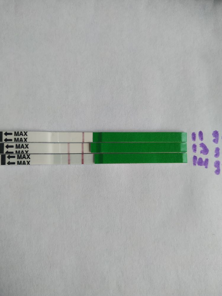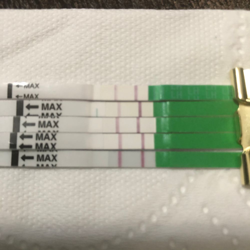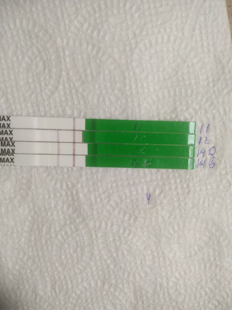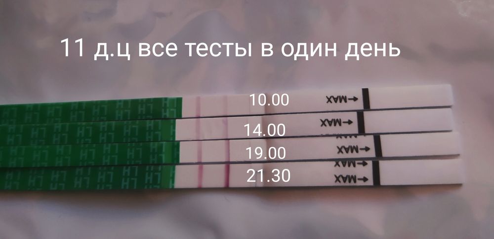 Овуляция( тесты на овуляцию)Девочки, кто хорошо разбирается в тестах на овуляцию, посмотрите пожалуйста!) Сверху 11дц, посередине13дц, нижний сегодня, 14дц. Как думаете, овуляция наступила?