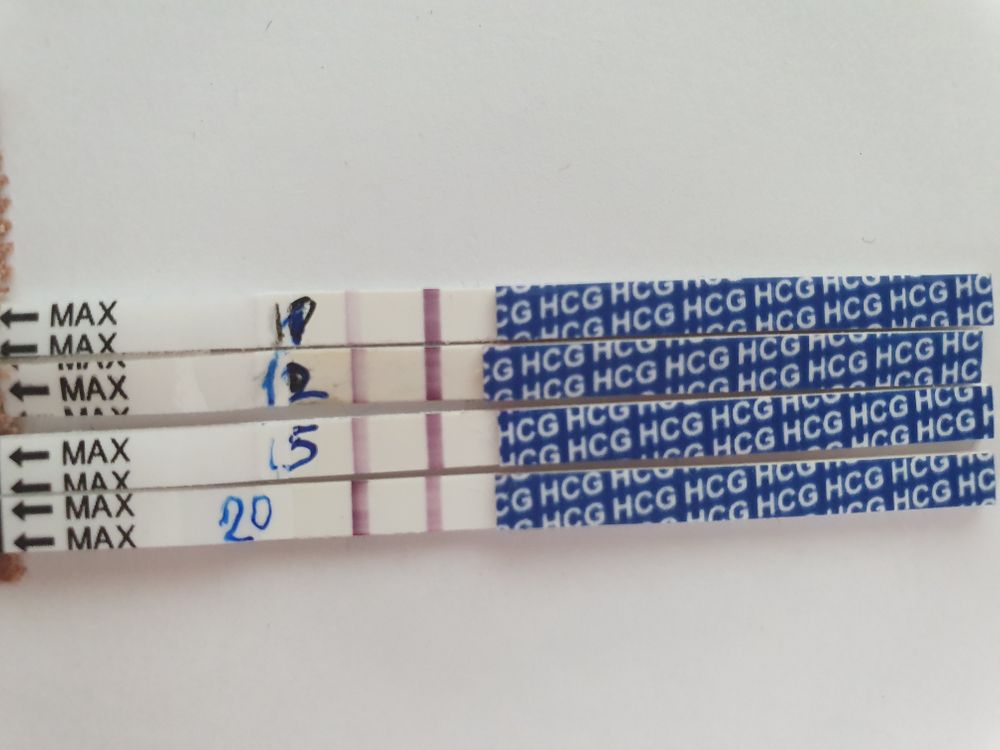 У меня 18 дпо, тесты полосатят с 9 дпо, динамика есть, но разница между полосками ещё видна. На фото сверху 17 дпо, снизу 18 дпо. Тесты фрау.