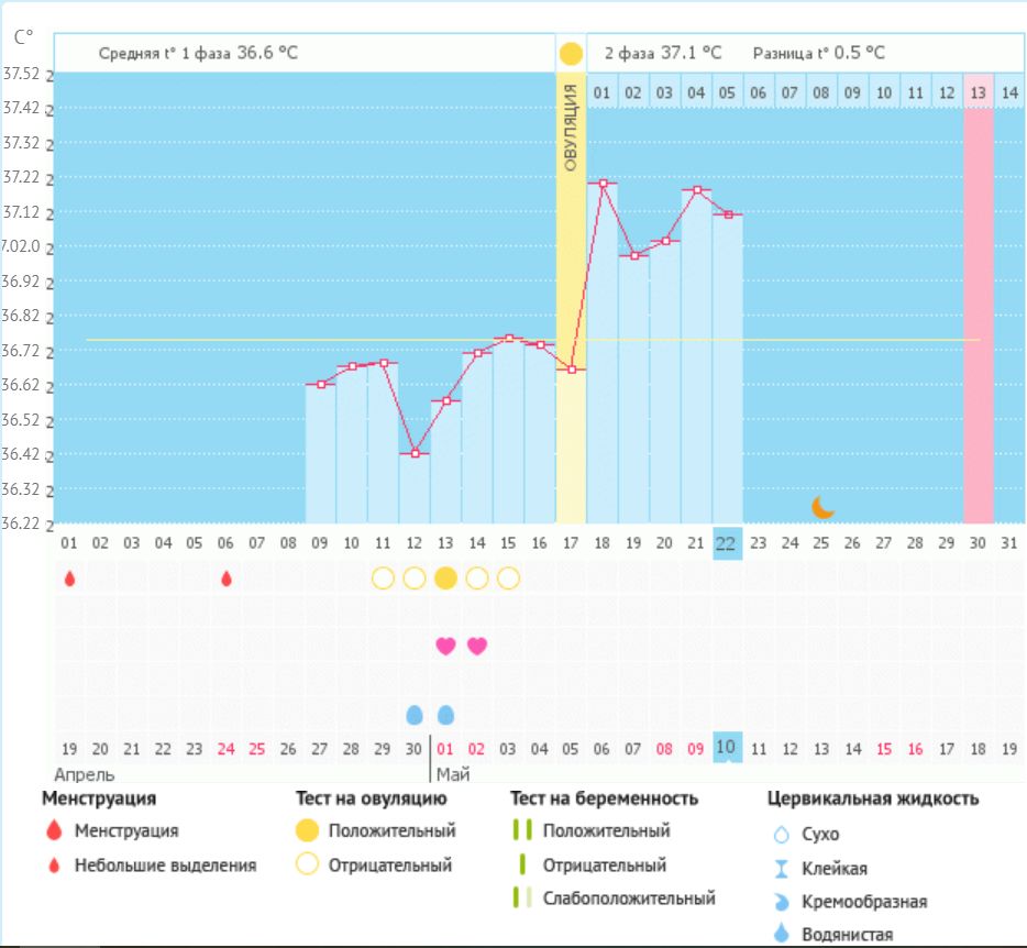 Базальная температура, ТТ, графики БТТесты на О от трех разных производителей были положительными 1.05, следовательно, примерно 2.05 была О, о чем говорят и другие признаки, но БТ стала расти только с 6.05., поэтому приложение выставило О 5.05. Когда все-таки была овуляция? Может быть разница в 4 дня между положительным тестом на О и самой О?