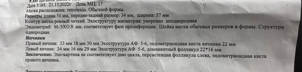 Правый яичник несколько мелких фолликул и эндометриоидная киста 22мм
